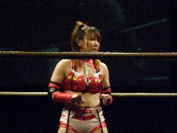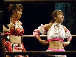 華名ワキ固めからアームストレッチ(右写真)、チェリーにタッチ。