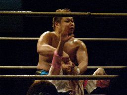 ロープに飛んで低空のランニングヒップアタック(右写真)、カウント3。