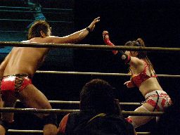 とうとう華名がリングイン(右写真)。マイケルが松永にタッチ要求、松永「後で焼肉おごる」の条件でタッチ。