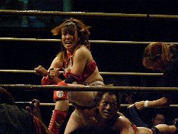 獲物を逃したマイケルは松永にタッチ。松永顔面にナックル、チョップからカバー、カウント2。マイケルにタッチ。マイケルはチェリーをロープに固定して尻で圧迫(右写真)。