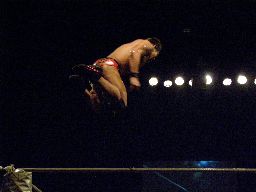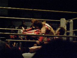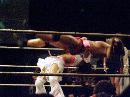 マイケルは松永を呼び込んでチェリーにダブルのショルダーブロック。マイケルコーナーに上りフロッグスプラッシュ(左写真)、カウント2。
