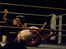 松永は「チェリー34歳!」と叫んで(真偽は不明です)ボディスラム(右写真)、カバー、カウント1。