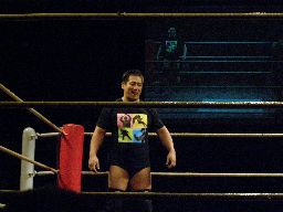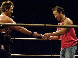 大社長の発案・ゴリ押しにより急遽行われることとなった全日本チェスト選手権。「的」のマイケルが松井レフェリーに引きずり出される(左写真)。よけたら解雇だそうだ。