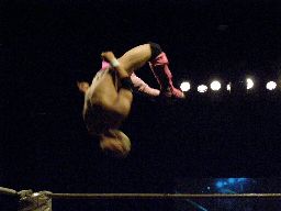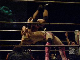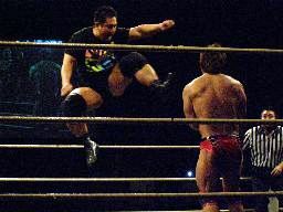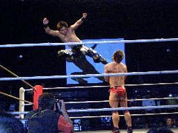 マイケルコーナーに上ってフロッグスプラッシュ(右写真)、カウント2。