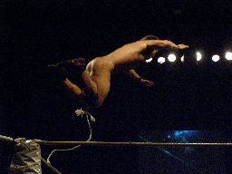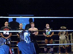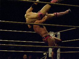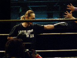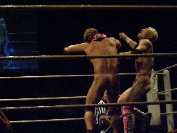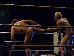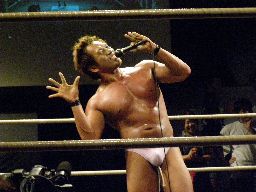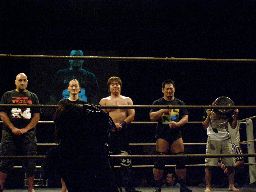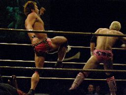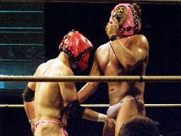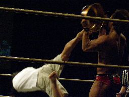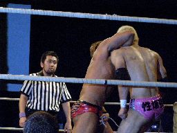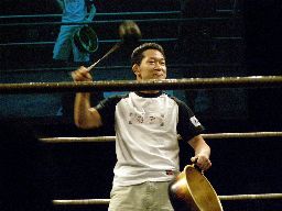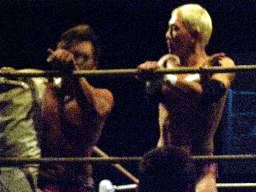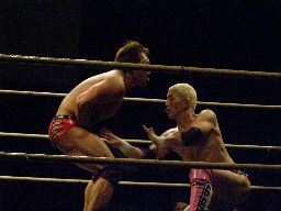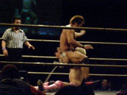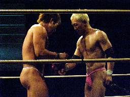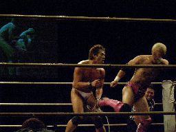 マイケルが退場しチェスト選手権で終りかなー、と思ったらマイケルが強制的に連れ戻されやっぱり予定通り変態世界一決定戦に。時刻は5時近くなり始発電車もすでに動いている。観客に漂う「どうでもいいよ」ムード。チェスト5発を食らってふらふらのマイケルに忍が攻め込む(右写真)。