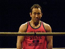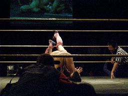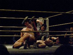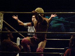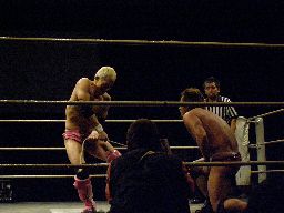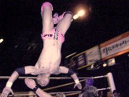 忍コーナーに上ってS.E.X.(左写真)、3カウント。