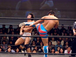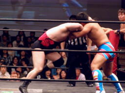 先発はアントンと中嶋、ロックアップ、ブレーク。またロックアップ、ブレーク。三度目アントンが押し込む(左写真)、中嶋体勢入れ替える。ロープに押し込んでパンチを打つ振り、ブレーク。