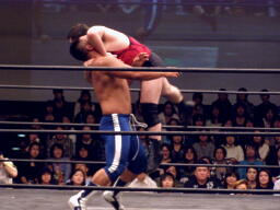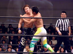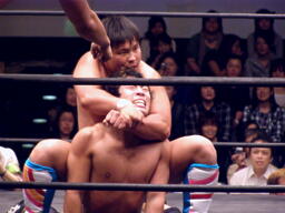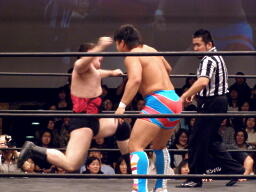 首投げで座らせた高梨に起田ダイビングショルダーブロック(左写真)、カウント2。ハンマーパンチ2発打って中嶋にタッチ。