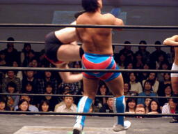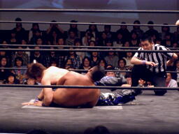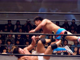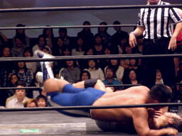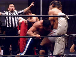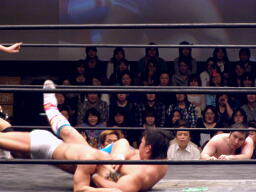 起田ボディスラム、ストンピング、キャメルクラッチ(左写真)。中嶋が高梨の胸板にキック、HARASHIMAがカット。起田は中嶋にタッチ。