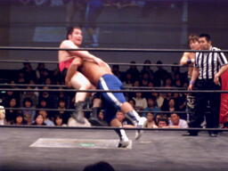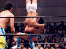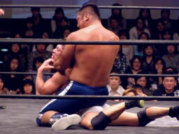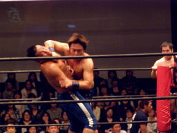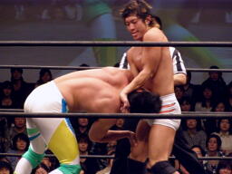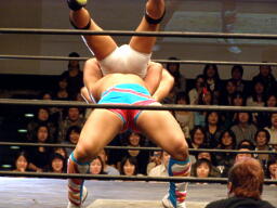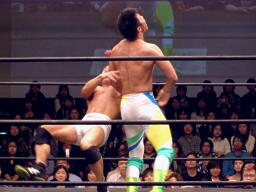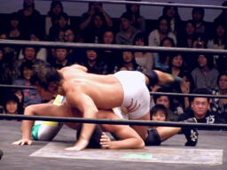 中嶋フロントネックロック(右写真)、高梨ロープ。中嶋は起田にタッチ。10分経過。