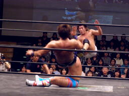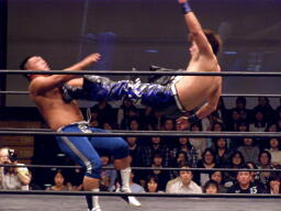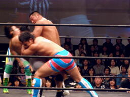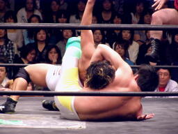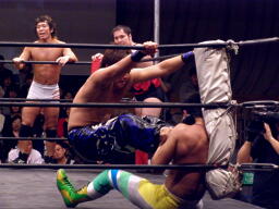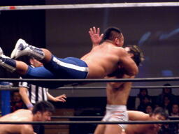 HARASHIMAスワンダイブプレス(右写真)、カウント2。HARASHIMAはアントンにタッチ。