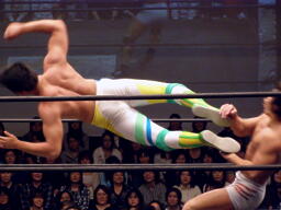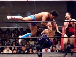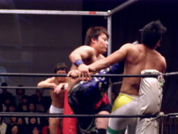 高梨は起田に延髄蹴り、HARASHIMAにタッチ。HARASHIMA起田にスワンダイブエルボー(左写真)。