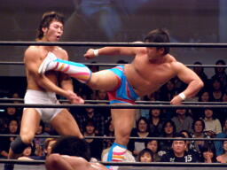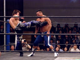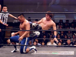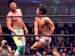 健介オフィス軍がアントンに3人攻撃の連続。アントンなんとか危機を脱出、HARASHIMAにタッチ。HARASHIMAが中嶋にチェストー!(左写真)