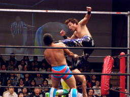 宮原ドロップキック(左写真)、これも低い。宮原は起田にタッチ。