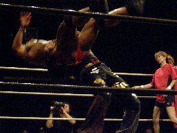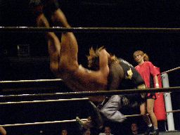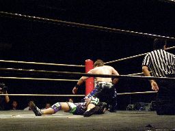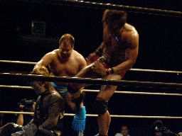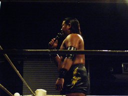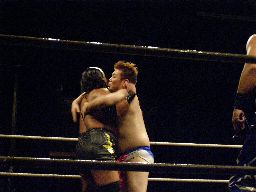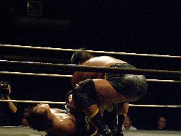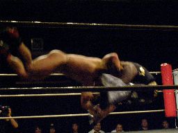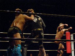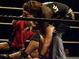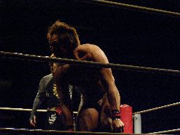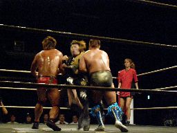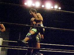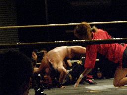 MIKAMIが場外で「ここから俺の反撃が・・・」とか言ってるうちにHARASHIMAが安部に蒼魔刀(右写真)、カウント3。