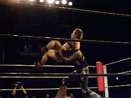 マイケルコーナーに上ってダイビングボディプレス、ポイズンかわす。松永はマイケルを花道に蹴り出すと「俺だってリーダーになりたいんだー!」とポイズンにキック。松永串刺しエルボー2発、カウント2。DDT、ラリアット、ポイズンかわしてスクールボーイ(左写真)、カウント2。5分経過。