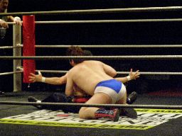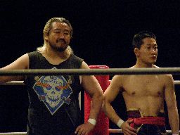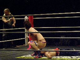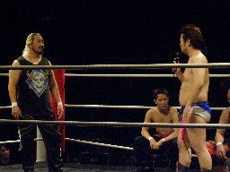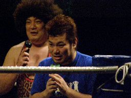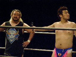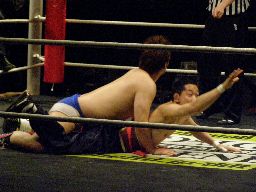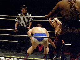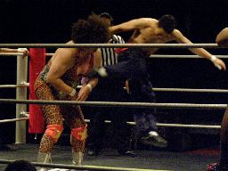 雁之助に見せ付けるようにナイトメア(右写真)。雁之助がエルボースタッブでカット、ディーノ趙雲の顔面に座る、カウント2。ディーノは坂井にタッチ。趙雲も雁之助にタッチ。