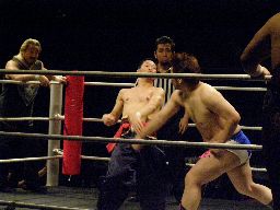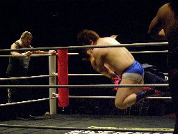 坂井固まったままの趙雲をボディスラム、趙雲全く姿勢変わらずに受ける。坂井カバー、カウント2。坂井エルボースタッブ2発(右写真)、コーナーに振って突っ込む、趙雲かわしてソバット、雁之助にタッチ。