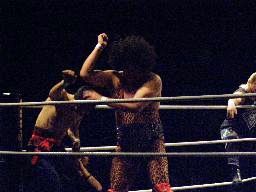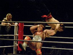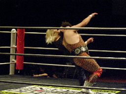 趙雲正拳、ソバット、ロープに飛んで追い越しざまにソバット(右写真)。さらにロープに飛ぶ、坂井肩に担ぐ、趙雲着地、ヒザ立ちの坂井にバックスピンキック(旭志織の「阿吽」の逆バージョンみたいな感じ)、カウント2。