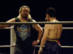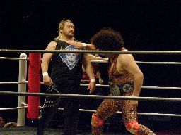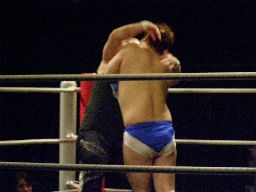 雁之助趙雲にタッチしようとするが趙雲は「靴の紐が・・」と紐のない靴を直す。ロックアップ、ディーノ雁之助にキス迫る(右写真)、雁之助ブロックしてまだかがんだままの趙雲の背中に強制タッチ。
