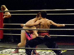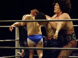 趙雲が「趙家に伝わる四千年の力!」と気を溜めているところをディーノ股間掴む(左写真)。その姿勢のままひきずられる趙雲を見て松井レフェリーも噴き出す、ディーノは坂井にタッチ。