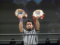 2本のベルトが松井レフェリーによって掲げられる(左写真)。