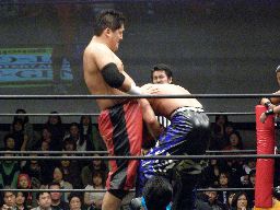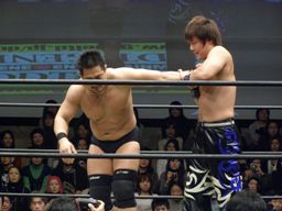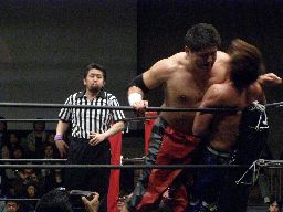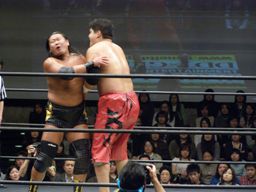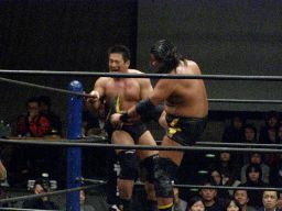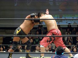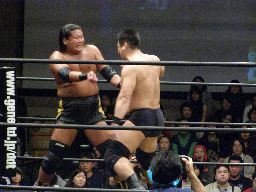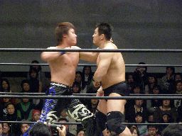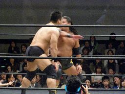 先発は大鷲と石川。ロックアップ(右写真)、押し合いから大鷲がロープに押し込む、離れ際にチョップ。再度ロックアップ、今度は石川がロープに押し込み離れ際に両手でチョップ。