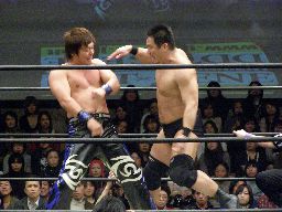 石川スリーパー(右写真)、HARASHIMAロープ。5分経過。石川は高木にタッチ。