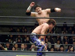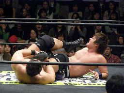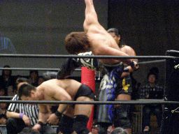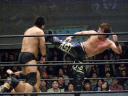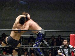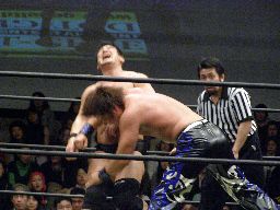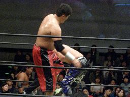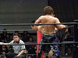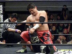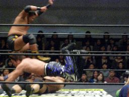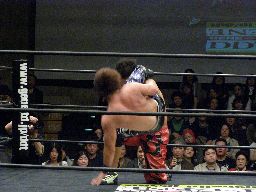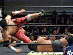 リバーススプラッシュ(左写真)、カウント2。いまひとつ高木の動きがよくないなあ。どっかで頭打ったか?