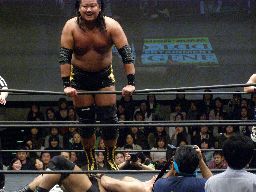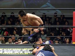 石川ニーリフト3連打(左写真)、コーナーにヒザで押し込みボディスラム、カウント2。