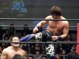 斃れた石川にHARASHIMAシャイニングウィザード式延髄蹴り(右写真)、大鷲にタッチ。