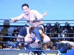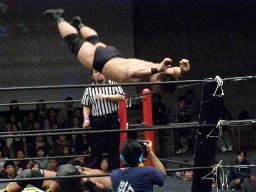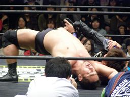大鷲は高木にビッグブーツ、石川にドラゴンスクリュー(右写真)。石川が場外転落、HARASHIMAスワンダイブプランチャで追撃。