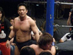 大鷲はロープ際に高木をボディスラム、腹から顔面に乗る(右写真)。HARASHIMAにタッチ。