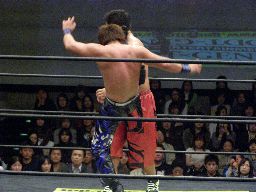 大鷲のギロチンドロップとHARASHIMAがスワンダイブプレスが同時に高木に落下(左写真)、HARASHIMAカバー、カウント2。