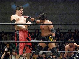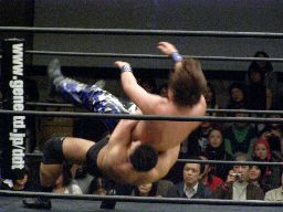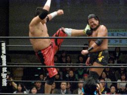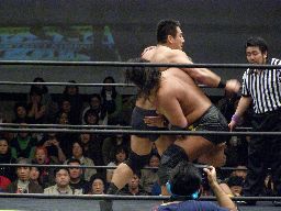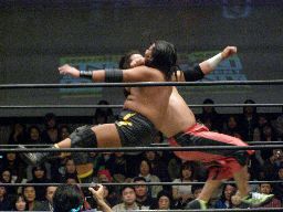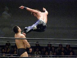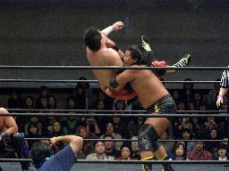 高木ボディスラム狙う、大鷲ブロックしてロープに飛ぶ、高木追いかけてサンシローズライン(左写真)、