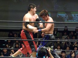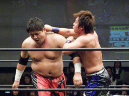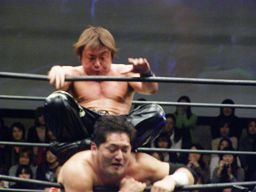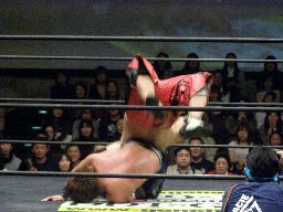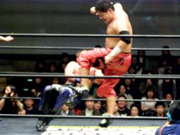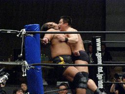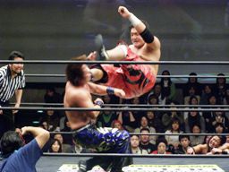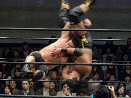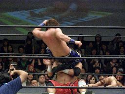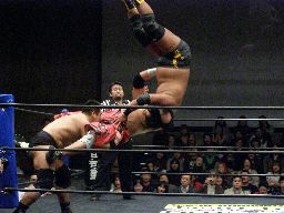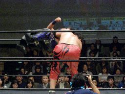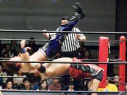 大鷲ダイビングボディプレス狙ってコーナーに上る、石川がコーナーに上がって雪崩式ブレーンバスター狙う、大鷲ブロック。高木が石川をパワーボムで投げる形で裏摩周の完成(左写真)。