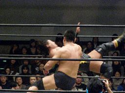 大鷲逆水平連打から助走を付けてジャンピングビッグブーツ(右写真)、石川もすぐにジャンピングニーで反撃、両者ダウン。