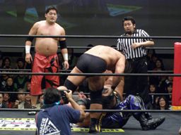 勝ち名乗りを受けるDISASTER-BOX(右写真)。石川と高木は退場。