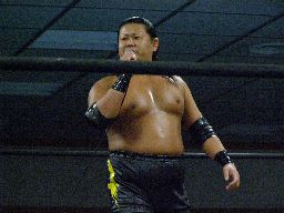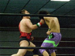 安部ドロップキック、トーゴースカして安部にパンチ(右写真)。トーゴーボディスラムからフィストドロップ、カウント2。
