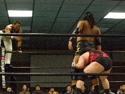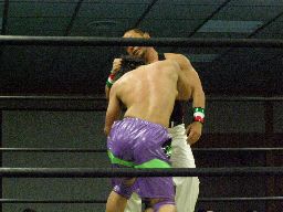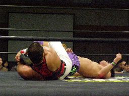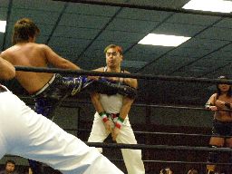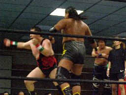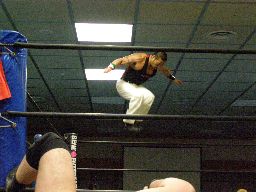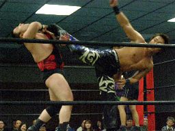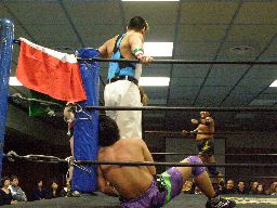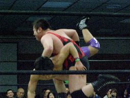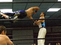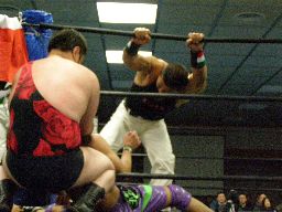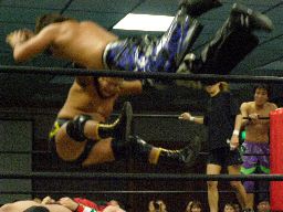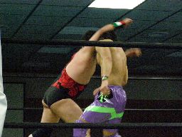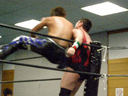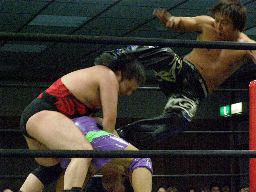 PIZAが大鷲を場外に出すとアントンが安部を肩車、トーゴーが飛んでイタリアン・インパクト(右写真)、アントンがカバー、カウント3。