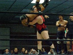 安部が志願してリングイン、ミサイルキック(左写真)からXファクター、カウント2。