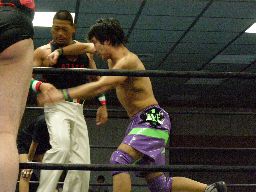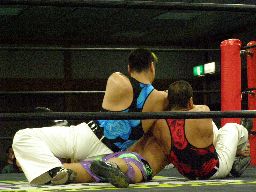 トーゴー首投げからヒザ十字(左写真)、安部ロープ。トーゴー安部の足にストンピング。