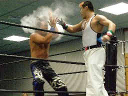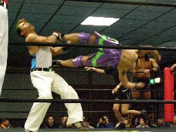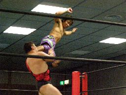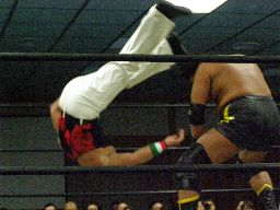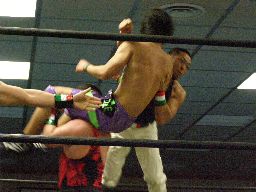 HARASHIMAアントンに山折り、助走を付けるためロープに下がる、PIZAがHARASHIMAにイタリアンパウダー(右写真)。