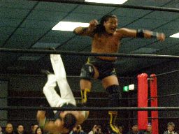 トーゴー串刺しラリアット、パワーボムからコーナーに上ってダイビングダブルフットスタンプ(右写真)、カウント2。