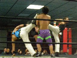HARASHIMAファルコンアロー狙う、PIZAブロック。HARASHIMAミドルキック(左写真)からハイキック、PIZAかわすがHARASHIMAはもう一発ハイキック、今度はヒット。PIZAもすかさずイタリアンマフィアキック。大鷲とトーゴーにタッチ。