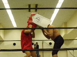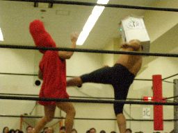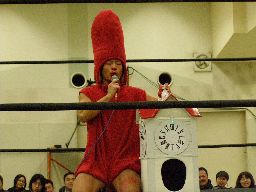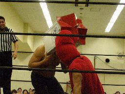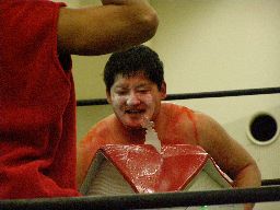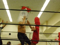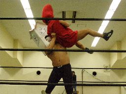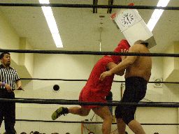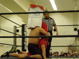 時計台男スプラッシュマウンテン?の体勢に(左写真)、たらこマン着地してロープに飛ぶ、時計台男カウンターのラリアット、カバー、たらこマンもカウント2で時を止める。松井レフェリーが不思議がる。