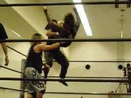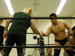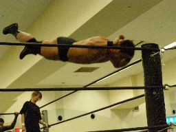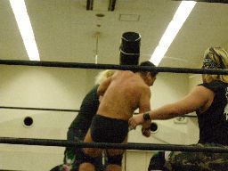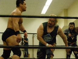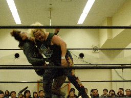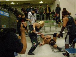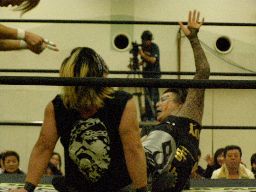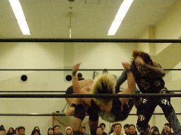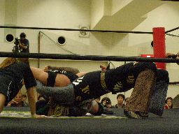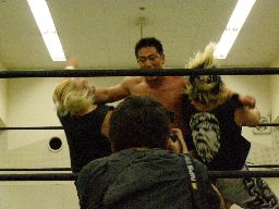 高木のサンダーファイヤーパワーボムとポイズンのチョークスラムの合体技(右写真)飛び出すがウラノは2で返す。15分経過。