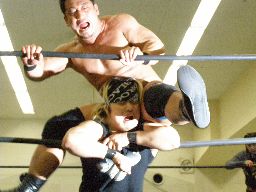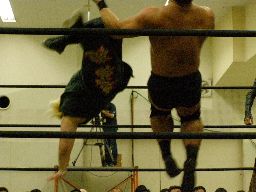 バックの取り合い、雁之助ブレークしてロープに飛ぶ、追いかけてサンシローズライン(右写真)。