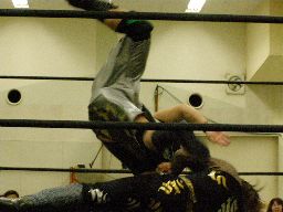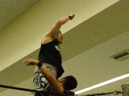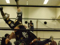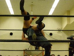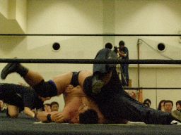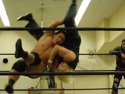 雁之助「ブレーンバスター!」と叫んでバックドロップ(右写真)、カウント2。ウラノがコーナーバッグを外す。レフェリーがチェックするとセコンドの安部のせいにする。