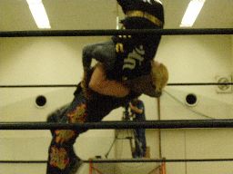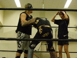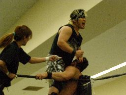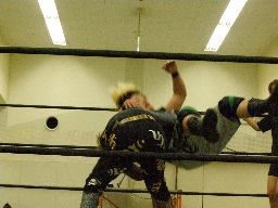 ロックアップ、ポイズンがウラノをアームホイップ(右写真)、ウラノは「髪〜」(引っ張られた)とアピール。再度ロックアップ、ポイズンホイップ、ウラノまた「髪〜」とアピールするがグレースは「見てた。引っ張ってない。」と却下。